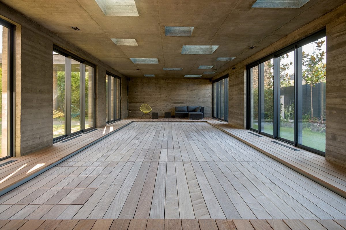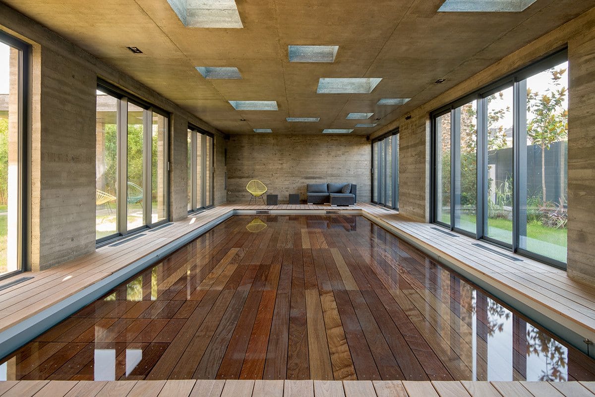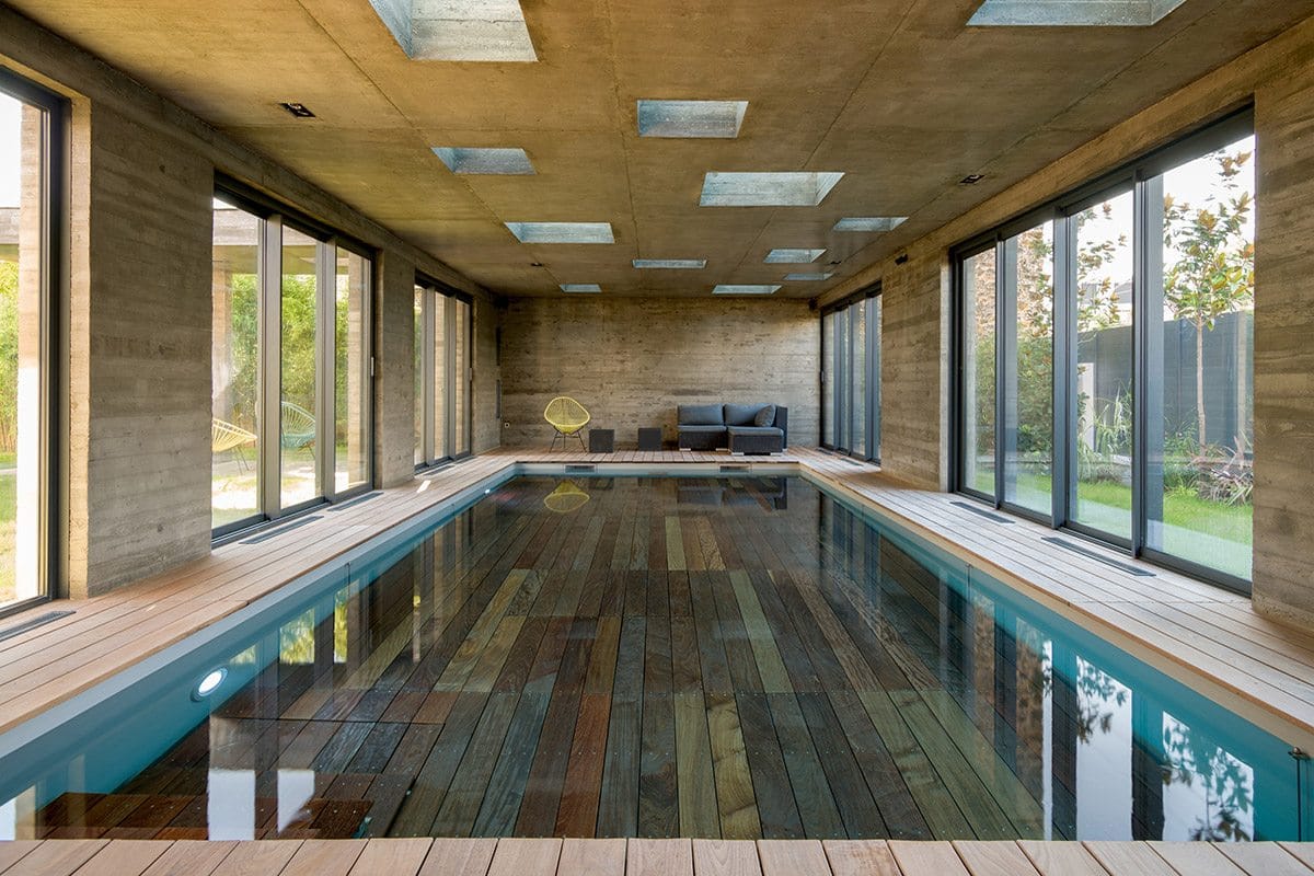 Piscine privée intérieure à fond mobile. Dimensions : 4 x 9 m, fond plat de 1,80 m. Structure béton armé avec escalier droit sur une partie de la largeur. Etanchéité membrane armée 150/100° gris clair. Réseau hydraulique développé. Filtration à sable. Régulation automatique. Chauffage PAC. Déshumidification. Nage à contre-courant. Margelles et fond mobile en ipé.
