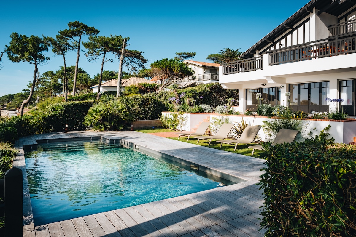 Piscine aux courbes généreuses, avec son spa attenant agrémenté de 4 jets